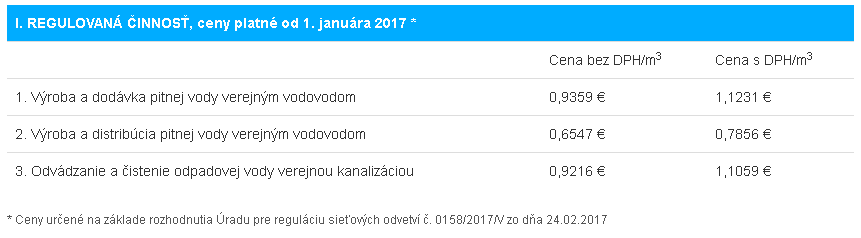 ÚRSO vo veci rozhodnutia o návrhu cien za výrobu a dodávku pitnej vody verejným vodovodom, výrobu a distribúciu pitnej vody verejným vodovodom a za odvádzanie a čistenie odpadovej vody verejnou kanalizáciou vydal dňa 24.02.2017 právoplatné cenové rozhodnutie č. 0158/2017/V, ktorým určil spoločnosti Bratislavská vodárenská spoločnosť, a. s., Prešovská 48, 826 46 Bratislava, IČO: 35 850 370 ceny platné na obdobie od 1. januára 2017 do 31. decembra 2021. Podľa § 14 ods. 12 zákona č. 250/2012 Z. z. o regulácii v sieťových odvetviach cenové rozhodnutie na prvý rok regulačného obdobia platí na celé regulačné obdobie od roku 2017 do roku 2021, ak úrad neschváli zmenu cenového rozhodnutia.
